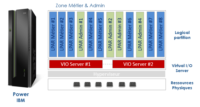 IBM sur ses environnements Power fourni nativement une solution de virtualisation. Celle-ci combinée avec les solutions d’activation des ressources à distance permet d’optimiser les couts de possession des infrastructures IBM.